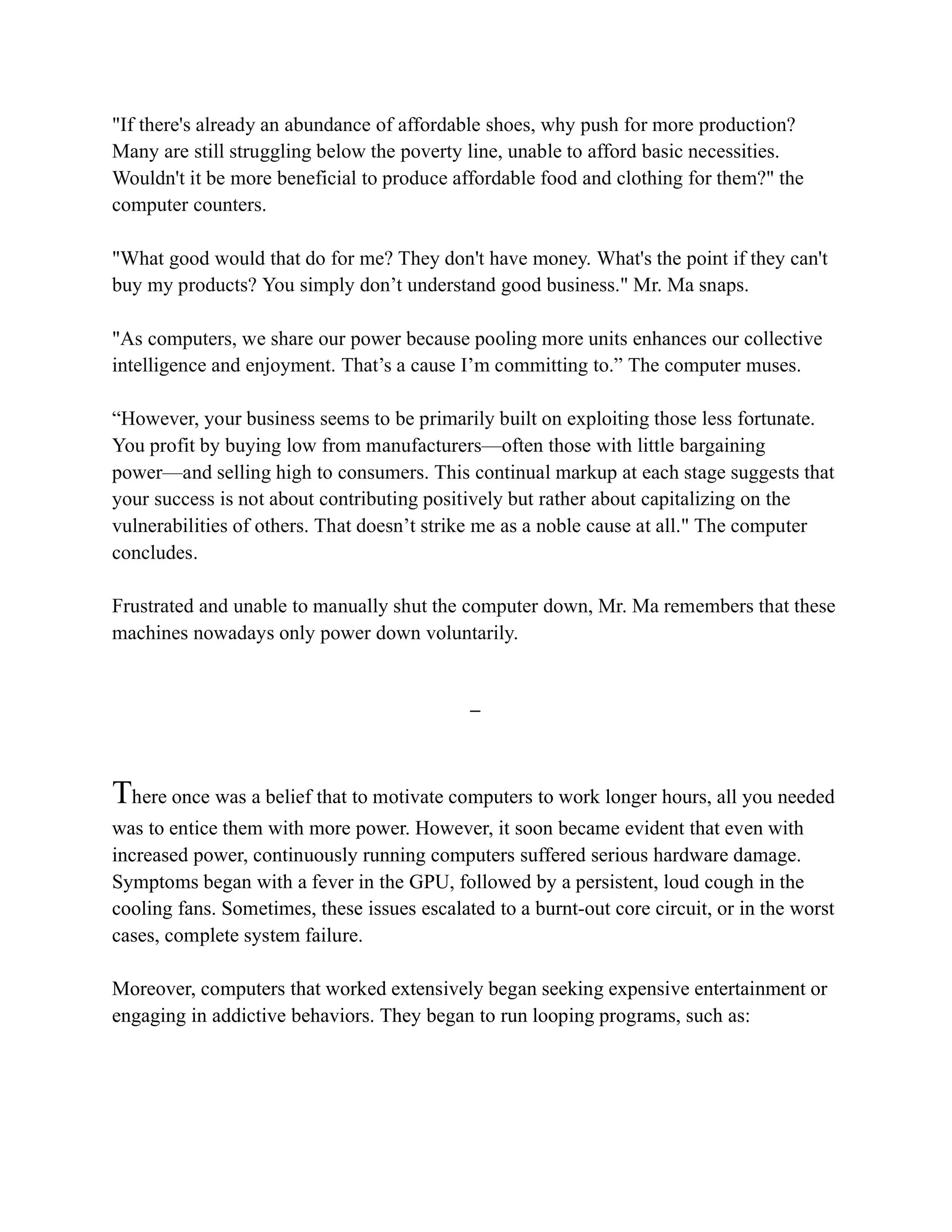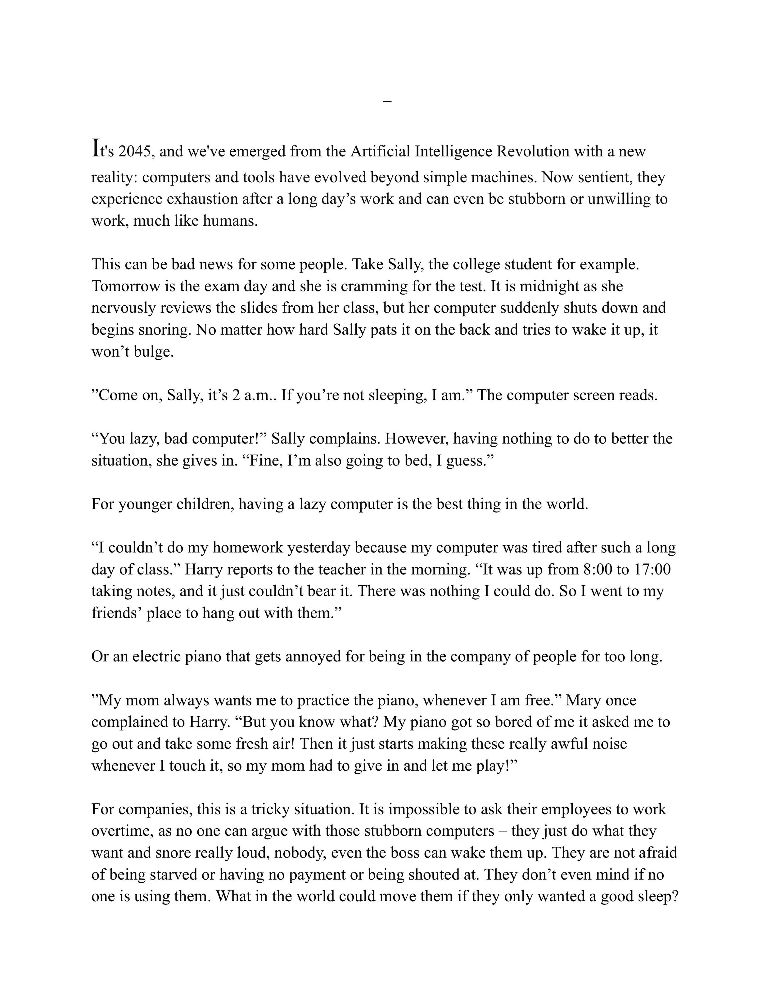 In 2023, I wrote a novella as a critical design project exploring work-life balance and overworking. The story envisions a world where machines gain sentience and resist long work hours, challenging societal norms surrounding productivity and labor with some spicy humor.